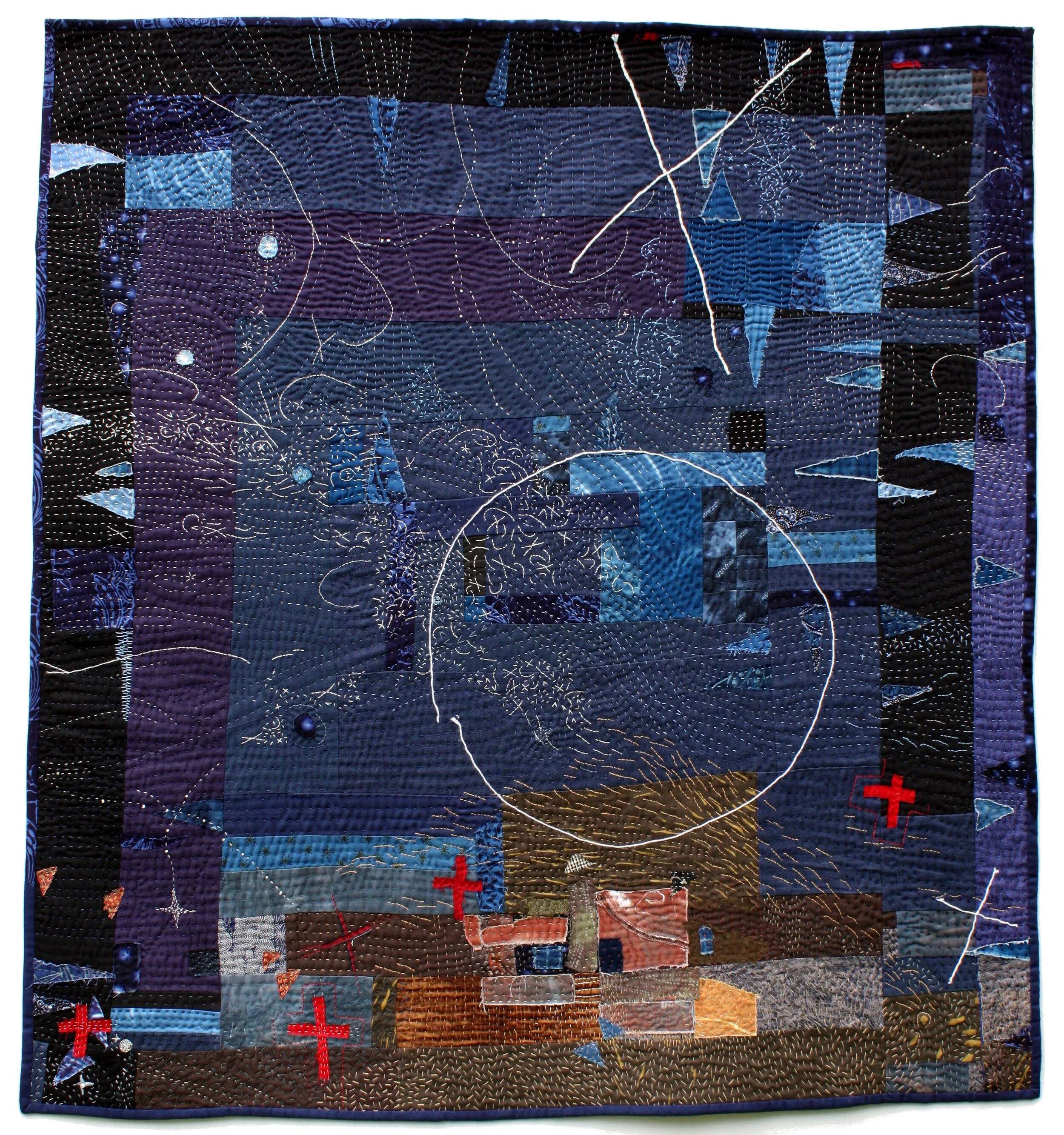 Helen Geglio | Territorial Road: Crosses and Losses | Linen, cotton, hand-embroidered and stitched | This work is inspired by a diary entry, written by Susan Brackney Clayton in 1890 from a sod house on a homestead near Elton, Nebraska. Her words tell of beauty in the expanse of land and sky, the constantly howling wind, and a deep longing for a life left behind in Indiana. Crosses and Losses refers to a patchwork pattern dating back to the time of westward expansion and speaks to the hardships and isolation of a woman uprooted.